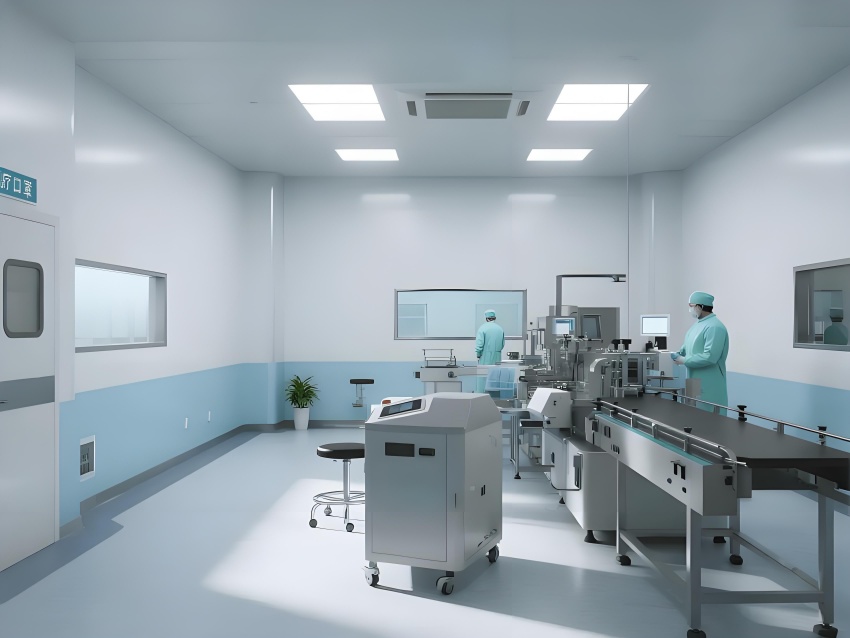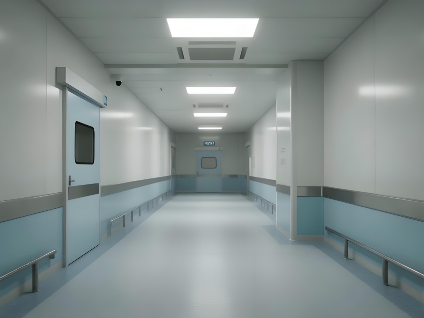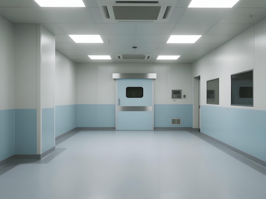 地面采用防靜電環(huán)氧自流平,耐磨無縫隙且易清潔;墻面為50mm厚抗菌彩鋼板,圓弧角處理避免積塵;頂面配置一體化鋁扣板吊頂,內(nèi)置FFU空氣過濾單元,與LED平板燈形成均勻照明。