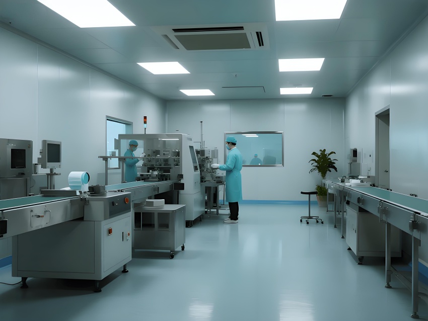 本潔凈車間設計采用現(xiàn)代工業(yè)極簡風格,強調(diào)功能性與潔凈度。主色調(diào)選用淺灰藍(墻面)與純白(頂面)的搭配,營造冷靜專業(yè)的氛圍,局部用淡綠色做視覺緩沖。