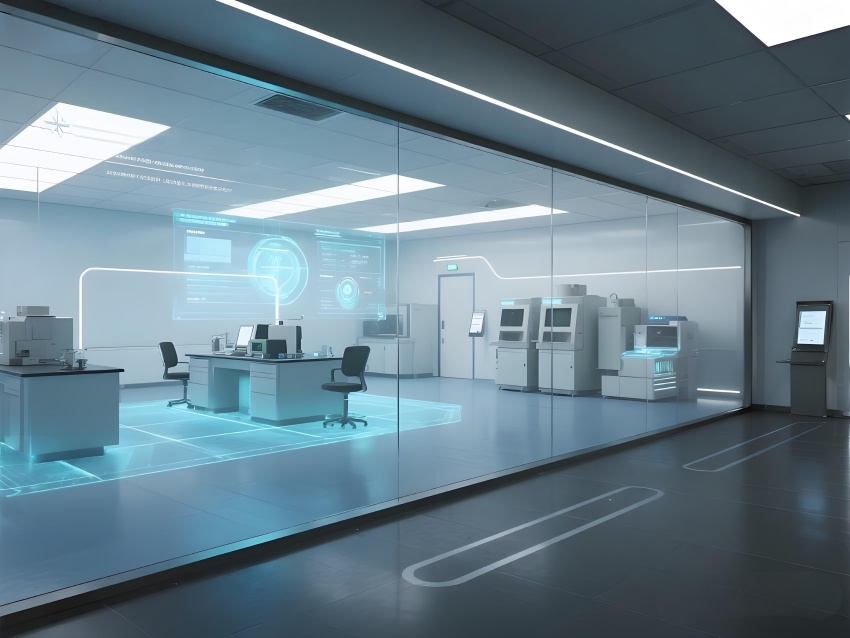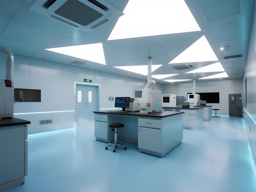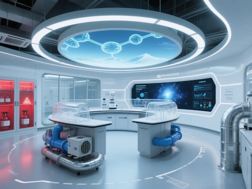 本實驗室以"絕對環(huán)境控制"為核心設(shè)計理念,整體采用冰川藍(lán)與鈦白灰的漸變配色。墻面嵌入式環(huán)境參數(shù)監(jiān)測屏實時流動著翡翠綠數(shù)據(jù)流,與頂棚矩陣排列的微孔送風(fēng)口形成科技韻律。核心實驗區(qū)采用圓弧形防結(jié)露玻璃隔斷,內(nèi)置百級潔凈層流罩。地面鋪設(shè)防靜電陶瓷鋼板,接縫處嵌入LED環(huán)境達標(biāo)指示燈。設(shè)備區(qū)裸露的銀色保溫管道與藍(lán)色冷媒管構(gòu)成工業(yè)美學(xué)展陳,智能除濕機組通過半透明外殼展示內(nèi)部冷凝過程。數(shù)據(jù)中控室配備270°曲面監(jiān)控屏,懸浮粒子濃度以動態(tài)星云圖呈現(xiàn)。空間通過嚴(yán)謹(jǐn)?shù)膸缀畏指钆c流體力學(xué)曲線結(jié)合,在極致環(huán)境控制要求下,打造出兼具科研嚴(yán)肅性與星際艙未來感的頂級實驗環(huán)境。