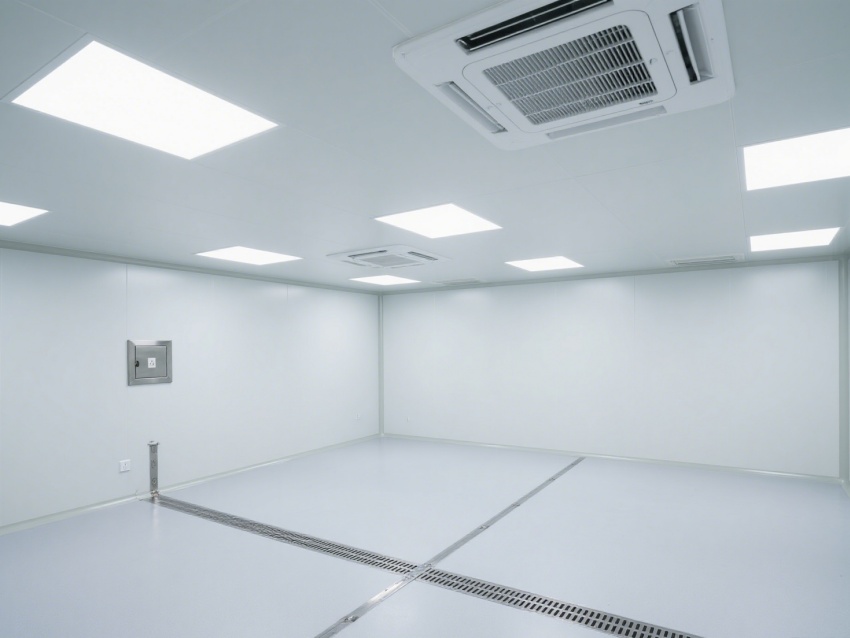 效果圖從多視角展現關鍵設計:正面全景圖呈現開闊無設備空間,預留充足布局靈活性;角落特寫聚焦墻面與地面無縫拼接工藝、圓弧收邊處理,規避積塵死角;側視圖清晰展示頂部十萬級高效送風口、回風夾道與壓差計,直觀傳遞潔凈控制核心;局部細節圖則凸顯地面防靜電環氧涂層的細膩質感,契合電子元件生產防護要求。?