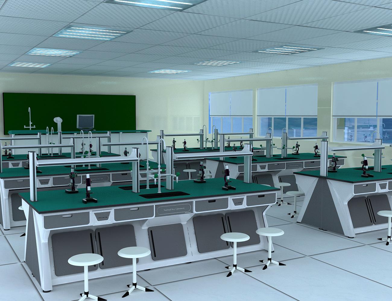 化驗室的家具包括實驗臺、設備臺、天平臺、高溫臺、通風柜、藥品柜、洗滌盆等。實驗臺結構一般為鋼木結構,家具臺面要求耐磨、耐酸堿腐蝕。實驗室的化驗臺、柜之間的間距應符合人體工程學要求,并滿足操作要求。放置分析儀器的設備臺一般離墻布置,留出600~1000mm的維修空間。中央化驗臺、設備臺根據需要設置插座和水管引入。