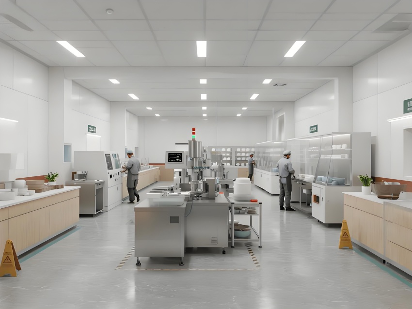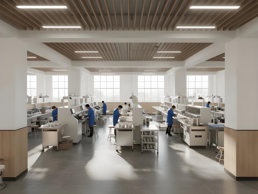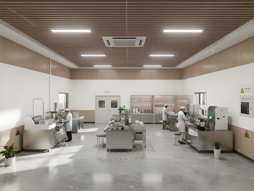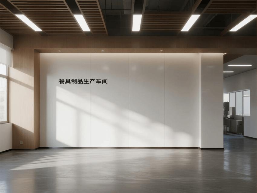 本餐具制品車間設(shè)計(jì)以現(xiàn)代簡約工業(yè)風(fēng)為核心,融合高效生產(chǎn)與視覺舒適性。色調(diào)以純凈白(墻面)、淺木色(倉儲柜)和不銹鋼銀灰(設(shè)備)為主,營造清爽專業(yè)的氛圍。