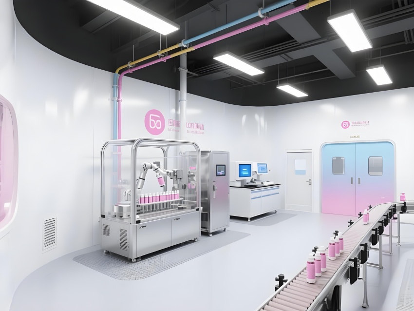 本車間以“科技感純凈美學”為設計語言,將化妝品行業的精致基因融入工業空間。純白主色調搭配品牌標志性的柔光粉點綴,墻面圓弧過渡的彩鋼板與地面淺灰導靜電地板構成潔凈基底。核心灌裝區透明層流罩內,機械臂精準抓取瓶體灌裝,冷銀色設備與粉色功能標識形成視覺對比。頂棚均勻分布的LED平板燈在乳化區投下無影光效,原料輸送管道通過色環編碼清晰區分。質檢實驗室的藍光檢測儀與包裝區高速傳送帶上的產品流,共同構建高效生產韻律。人員通道的智能風淋室采用漸變色玻璃,科技感與人性化并存。整體空間通過嚴格的功能分區與柔和的色彩管理,打造符合國際標準的化妝品智造殿堂。